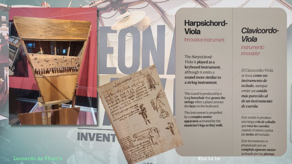 The Harpsichord-Viola is a unique hybrid instrument that combines features of a harpsichord and a viola. Its operation and design were unlike anything seen before during Leonardo's time.